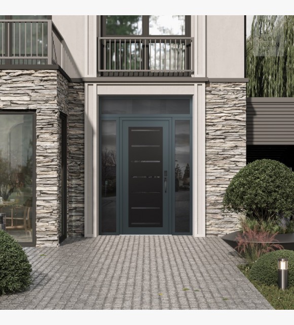 Modern Steel Front Door Diamond C11 64" x 96" anthracite/anthracite mirrored Glass Panel black LHI with 2 Sidelites and Transom mirrored Glass