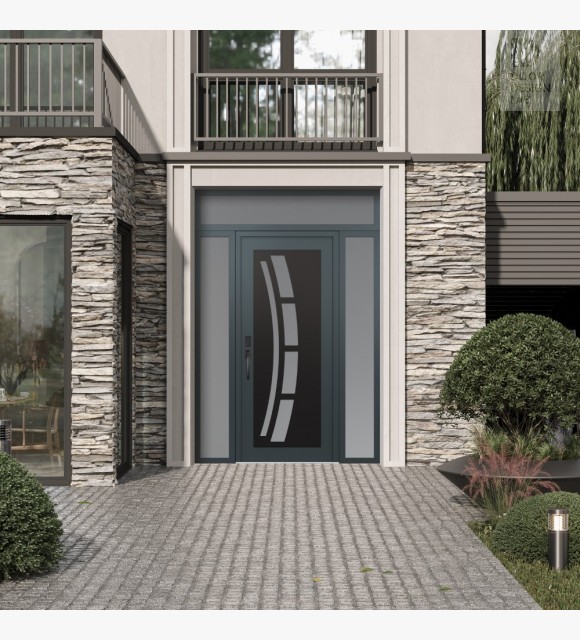 Modern Steel Front Door Diamond C12 60" x 96" anthracite/anthracite frosted Glass Panel black RHI with 2 Sidelites and Transom frosted Glass