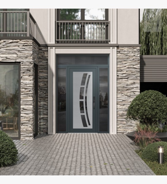 Modern Steel Front Door Diamond C12 60" x 96" anthracite/anthracite mirrored Glass Panel stainless steel LHI with 2 Sidelites and Transom mirrored Glass