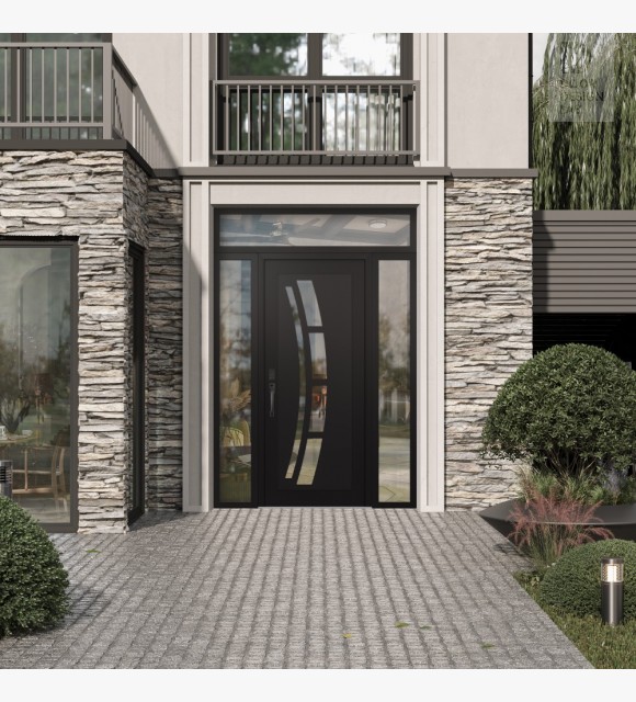 The door unit kit includes a transom and two sidelites, which are decorative stationary sections installed above, to the left and to the right of the exterior door.