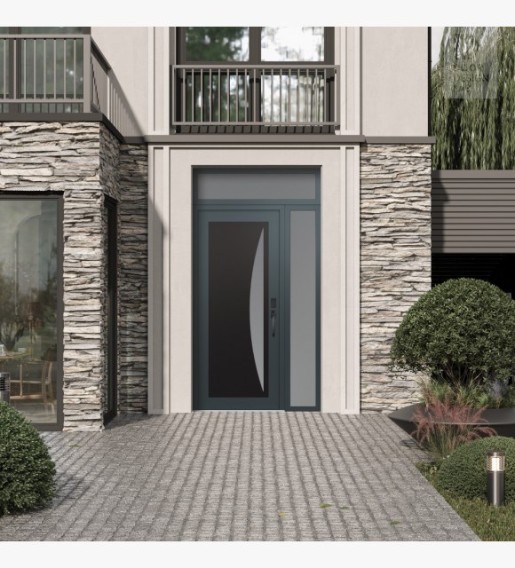 Modern Steel Front Door Diamond C13 50" x 96" anthracite/anthracite frosted Glass Panel black LHI with Sidelite and Transom frosted Glass