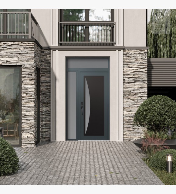 Modern Steel Front Door Diamond C13 52" x 96" anthracite/anthracite frosted Glass Panel black RHI with Sidelite and Transom frosted Glass