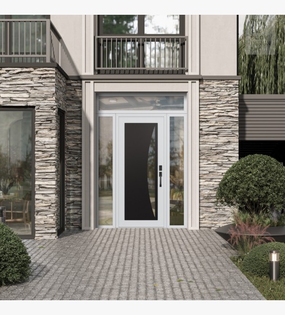 The door unit kit includes a transom and two sidelites, which are decorative stationary sections installed above, to the left and to the right of the exterior door.