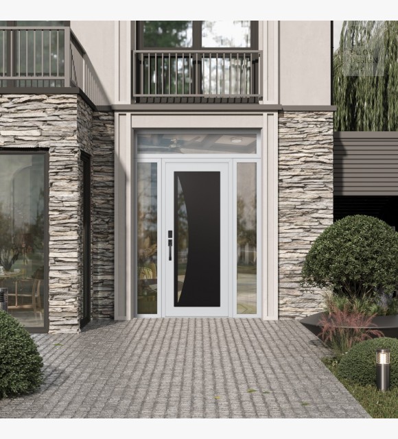The door unit kit includes a transom and two sidelites, which are decorative stationary sections installed above, to the left and to the right of the exterior door.