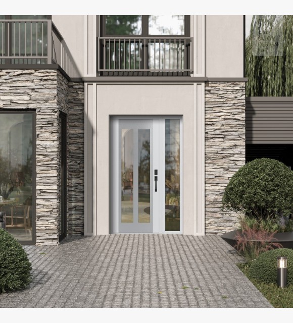 The double-chamber glazing combined with polystyrene insulation reduces heat loss by 40-50% compared to conventional exterior doors: