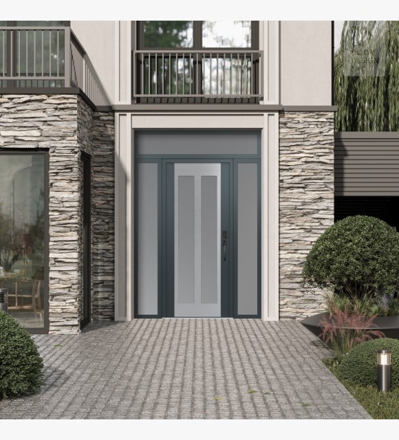 Modern Steel Front Door Diamond C14 60" x 96" anthracite/anthracite frosted Glass Panel stainless steel LHI with 2 Sidelites and Transom frosted Glass