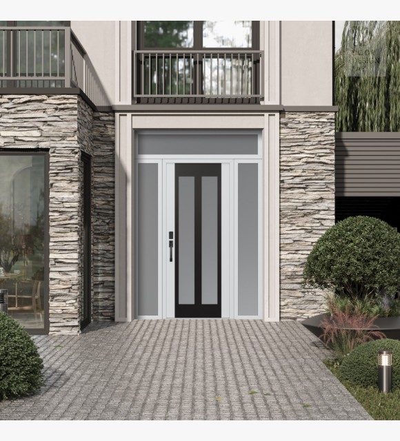 The door unit kit includes a transom and two sidelites, which are decorative stationary sections installed above, to the left and to the right of the exterior door.