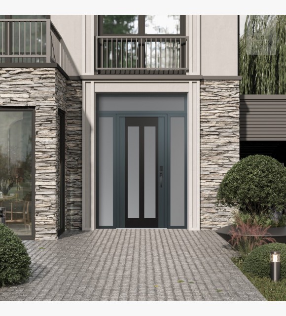 Modern Steel Front Door Diamond C14 64" x 96" anthracite/anthracite frosted Glass Panel black LHI with 2 Sidelites and Transom frosted Glass