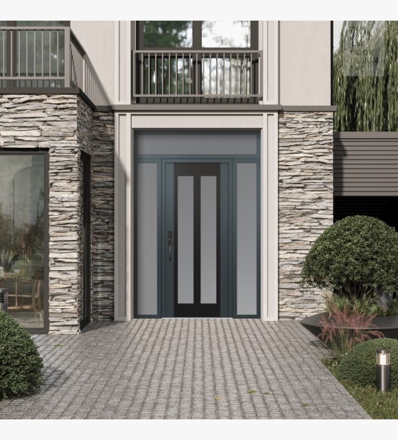 Modern Steel Front Door Diamond C14 68" x 96" anthracite/anthracite frosted Glass Panel black RHI with 2 Sidelites and Transom frosted Glass