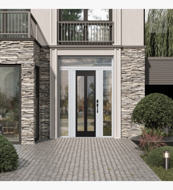 The door unit kit includes a transom and two sidelites, which are decorative stationary sections installed above, to the left and to the right of the exterior door.