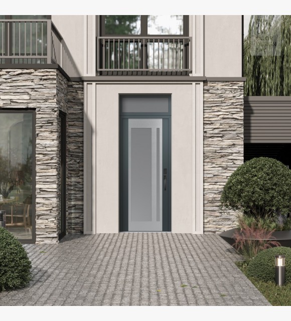 Modern Steel Front Door Diamond C15 36" x 96" anthracite/anthracite frosted Glass Panel stainless steel LHI with Transom frosted Glass