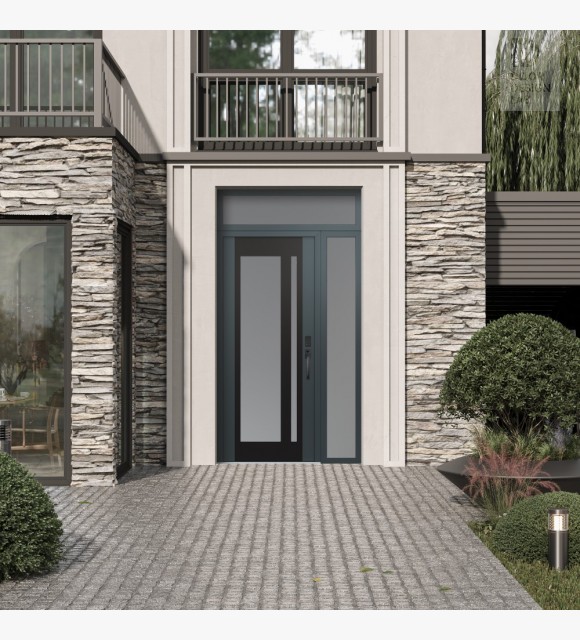Modern Steel Front Door Diamond C15 52" x 96" anthracite/anthracite frosted Glass Panel black LHI with Sidelite and Transom frosted Glass