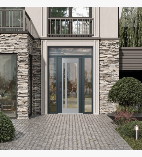Modern Steel Front Door Diamond C15 60" x 96" anthracite/anthracite clear Glass Panel stainless steel RHI with 2 Sidelites and Transom clear Glass