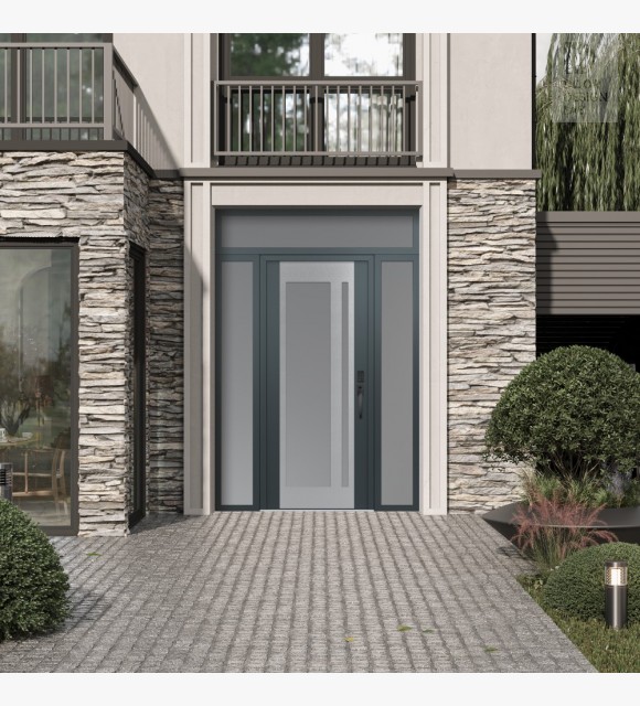 Modern Steel Front Door Diamond C15 60" x 96" anthracite/anthracite frosted Glass Panel stainless steel LHI with 2 Sidelites and Transom frosted Glass
