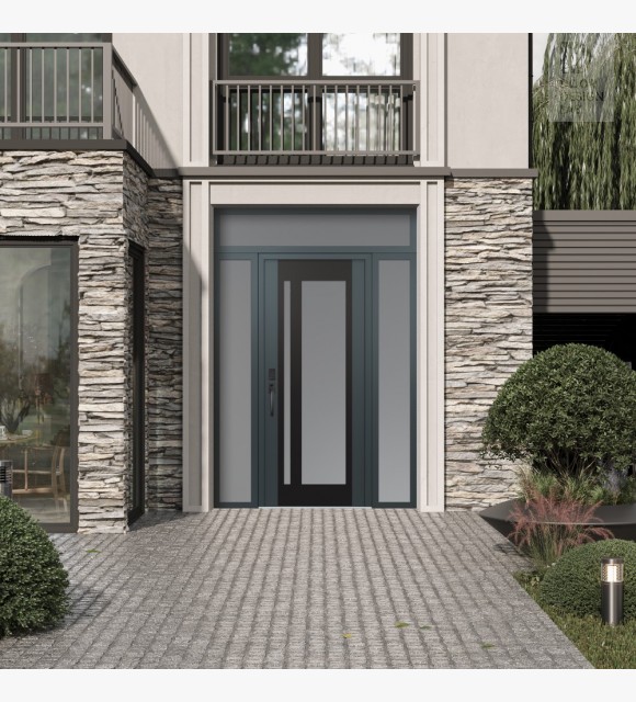 Modern Steel Front Door Diamond C15 64" x 96" anthracite/anthracite frosted Glass Panel black RHI with 2 Sidelites and Transom frosted Glass