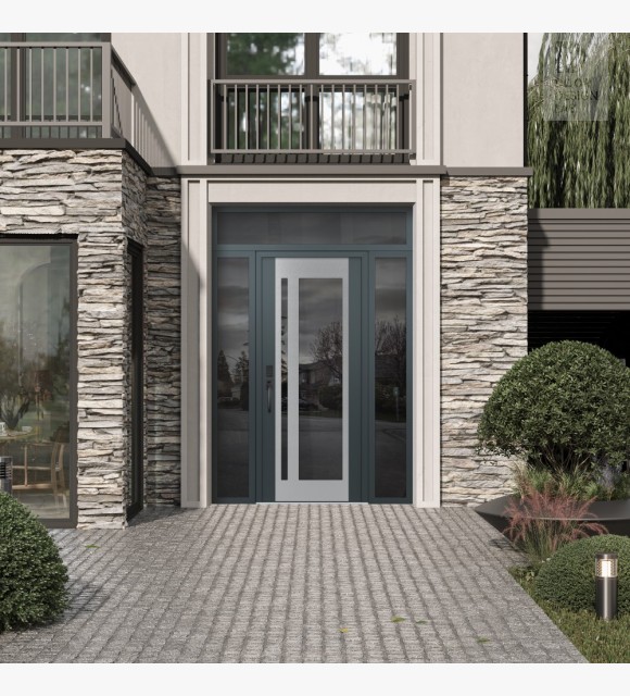 Modern Steel Front Door Diamond C15 68" x 96" anthracite/anthracite mirrored Glass Panel stainless steel RHI with 2 Sidelites and Transom mirrored Glass