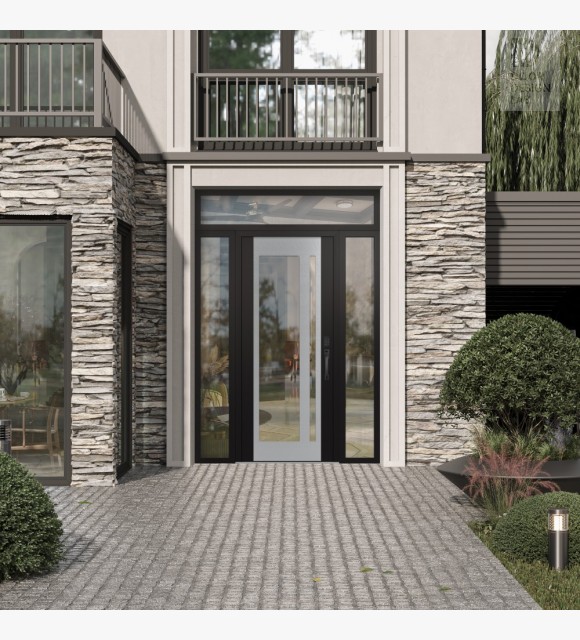 The door unit kit includes a transom and two sidelites, which are decorative stationary sections installed above, to the left and to the right of the exterior door.