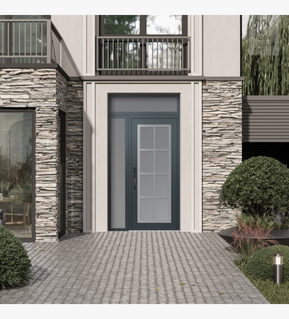 Modern Steel Front Door Diamond C16 50" x 96" anthracite/anthracite frosted Glass Panel stainless steel RHI with Sidelite and Transom frosted Glass