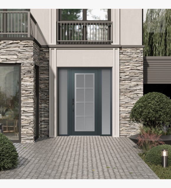 Modern Steel Front Door Diamond C16 60" x 80" anthracite/anthracite frosted Glass Panel stainless steel RHI with 2 Sidelites frosted Glass