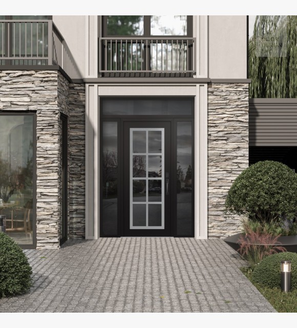 The door unit kit includes a transom and two sidelites, which are decorative stationary sections installed above, to the left and to the right of the exterior door.