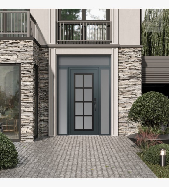 Modern Steel Front Door Diamond C16 64" x 96" anthracite/anthracite frosted Glass Panel black LHI with 2 Sidelites and Transom frosted Glass