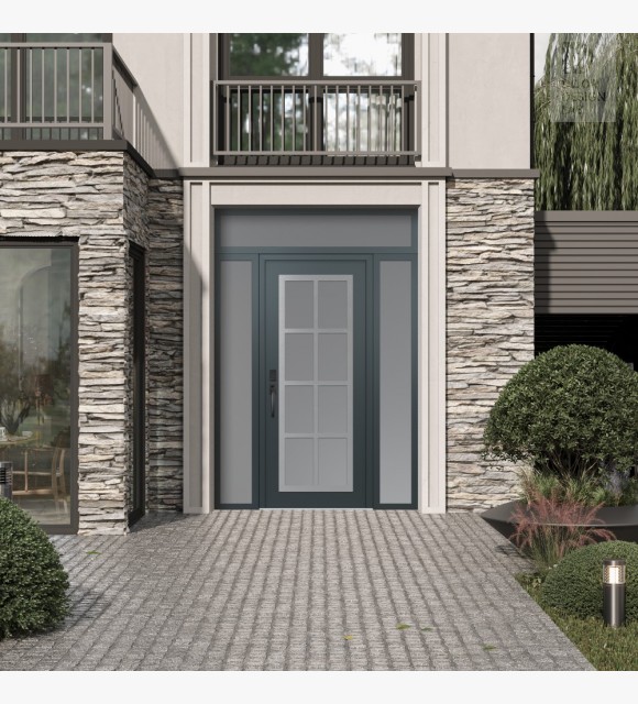 Modern Steel Front Door Diamond C16 68" x 96" anthracite/anthracite frosted Glass Panel stainless steel RHI with 2 Sidelites and Transom frosted Glass