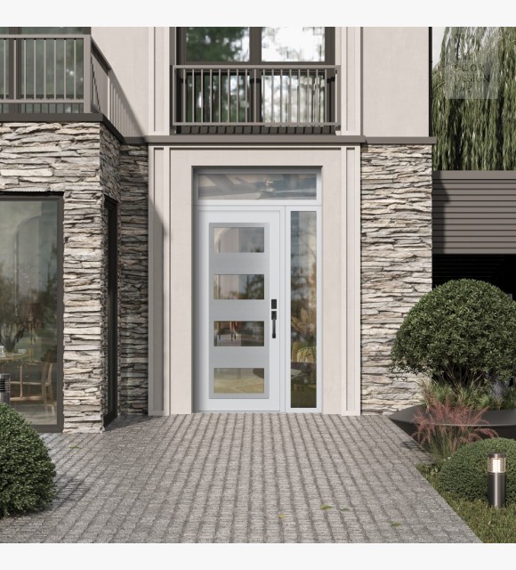 Modern Steel Front Door Diamond C2 50" x 96" white/white clear Glass Panel stainless steel LHI with Sidelite and Transom clear Glass