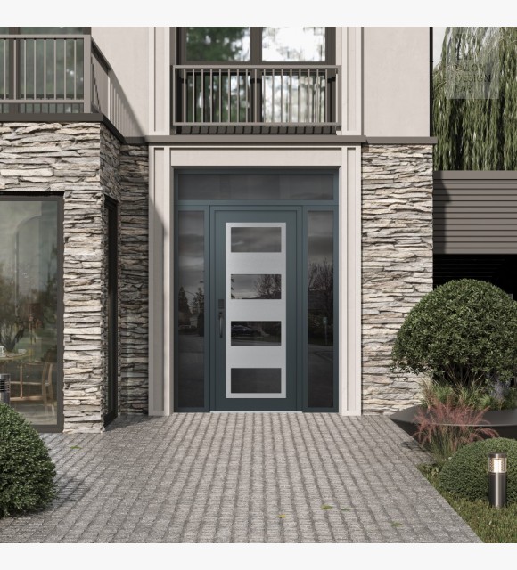 Modern Steel Front Door Diamond C2 64" x 96" anthracite/anthracite mirrored Glass Panel stainless steel RHI with 2 Sidelites and Transom mirrored Glass