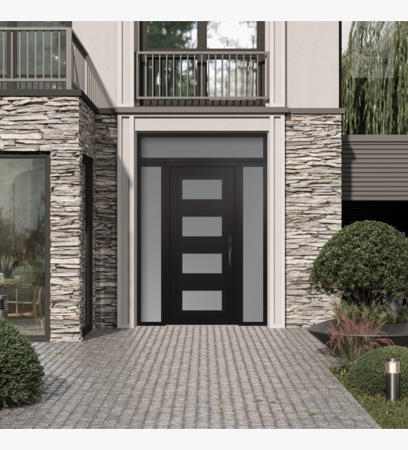 Modern Steel Front Door Diamond C2 64" x 96" black/white frosted Glass Panel black LHI with 2 Sidelites and Transom frosted Glass