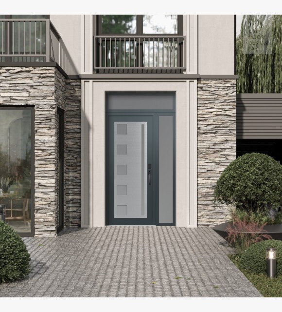 Modern Steel Front Door Diamond C3 48" x 96" anthracite/anthracite frosted Glass Panel stainless steel LHI with Sidelite and Transom frosted Glass