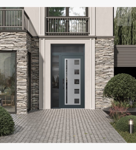 Modern Steel Front Door Diamond C3 48" x 96" anthracite/anthracite mirrored Glass Panel stainless steel RHI with Sidelite and Transom mirrored Glass