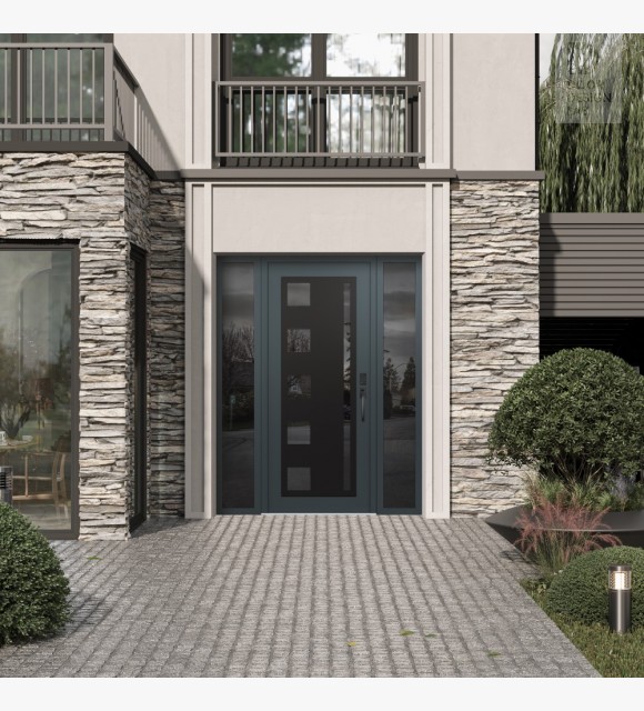 Modern Steel Front Door Diamond C3 68" x 80" anthracite/anthracite mirrored Glass Panel black LHI with 2 Sidelites mirrored Glass
