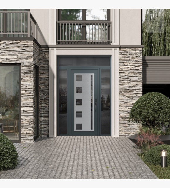 Modern Steel Front Door Diamond C3 68" x 96" anthracite/anthracite mirrored Glass Panel stainless steel LHI with 2 Sidelites and Transom mirrored Glass