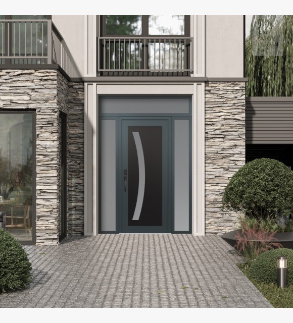 Modern Steel Front Door Diamond C4 60" x 96" anthracite/anthracite frosted Glass Panel black RHI with 2 Sidelites and Transom frosted Glass
