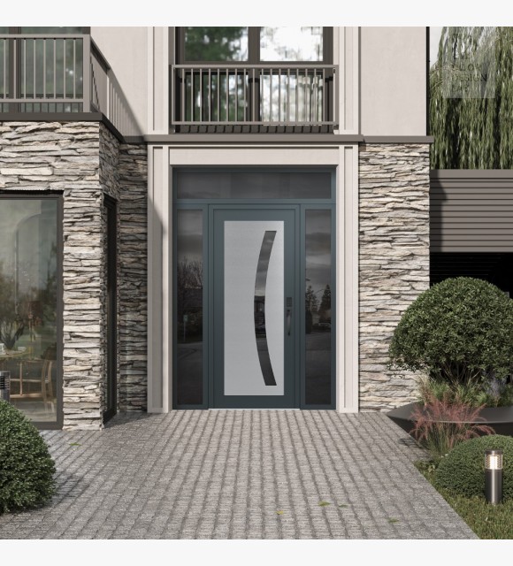 Modern Steel Front Door Diamond C4 68" x 96" anthracite/anthracite mirrored Glass Panel stainless steel LHI with 2 Sidelites and Transom mirrored Glass