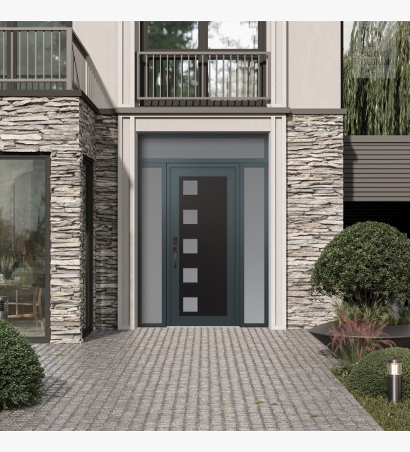 Modern Steel Front Door Diamond C5 60" x 96" anthracite/anthracite frosted Glass Panel black RHI with 2 Sidelites and Transom frosted Glass