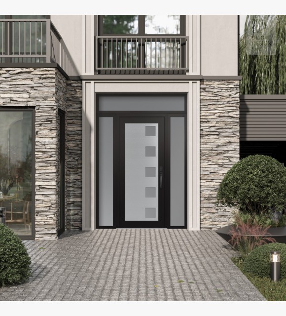 The door unit kit includes a transom and two sidelites, which are decorative stationary sections installed above, to the left and to the right of the exterior door.