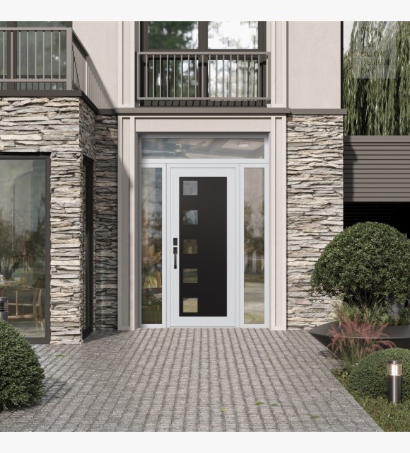 The door unit kit includes a transom and two sidelites, which are decorative stationary sections installed above, to the left and to the right of the exterior door.