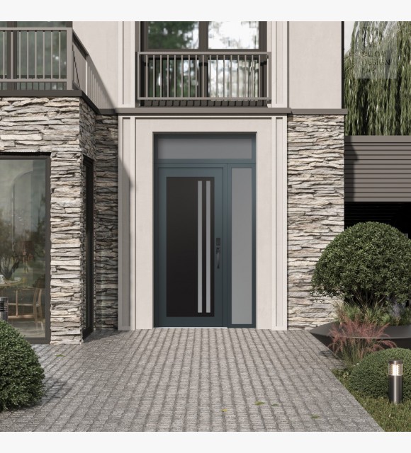 Modern Steel Front Door Diamond C6 52" x 96" anthracite/anthracite frosted Glass Panel black LHI with Sidelite and Transom frosted Glass