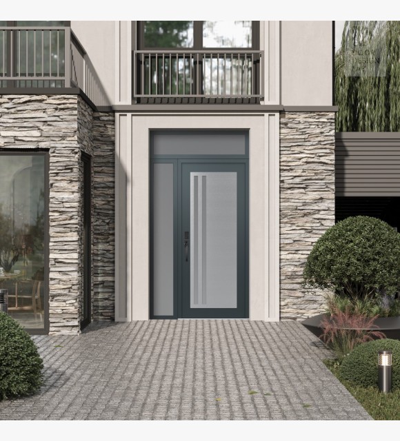 Modern Steel Front Door Diamond C6 52" x 96" anthracite/anthracite frosted Glass Panel stainless steel RHI with Sidelite and Transom frosted Glass