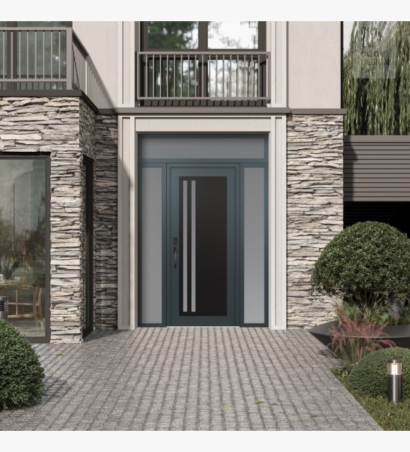 Modern Steel Front Door Diamond C6 60" x 96" anthracite/anthracite frosted Glass Panel black RHI with 2 Sidelites and Transom frosted Glass