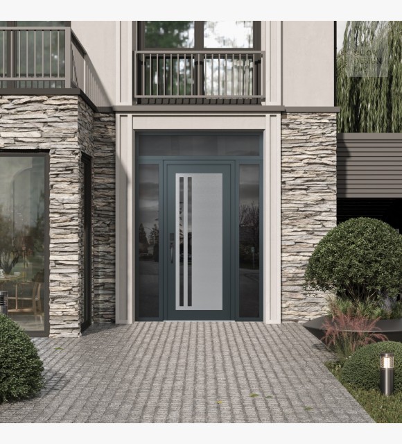 Modern Steel Front Door Diamond C6 60" x 96" anthracite/anthracite mirrored Glass Panel stainless steel RHI with 2 Sidelites and Transom mirrored Glass