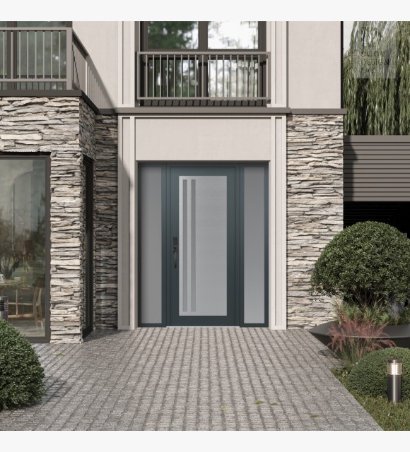 Modern Steel Front Door Diamond C6 64" x 80" anthracite/anthracite frosted Glass Panel stainless steel RHI with 2 Sidelites frosted Glass