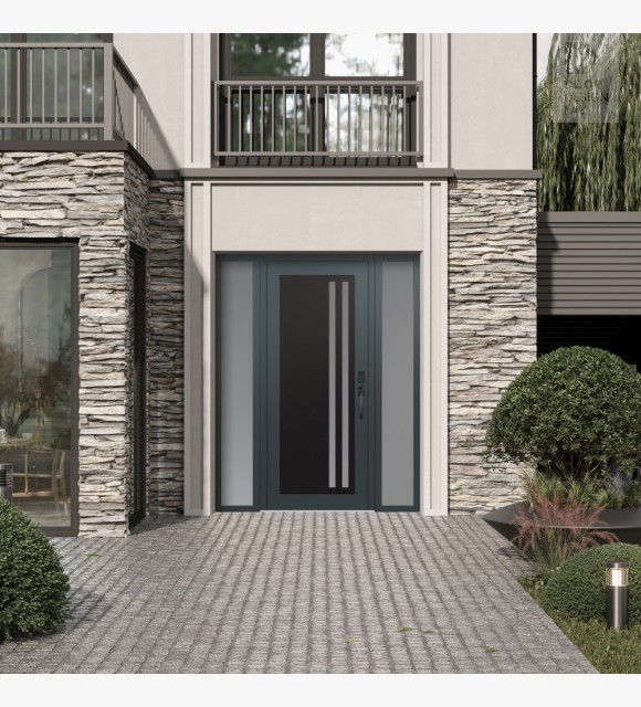 Modern Steel Front Door Diamond C6 68" x 80" anthracite/anthracite frosted Glass Panel black LHI with 2 Sidelites frosted Glass