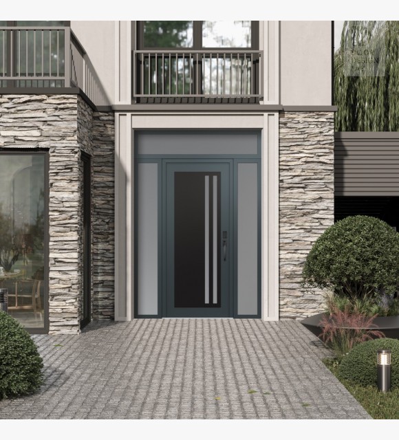 Modern Steel Front Door Diamond C6 68" x 96" anthracite/anthracite frosted Glass Panel black LHI with 2 Sidelites and Transom frosted Glass