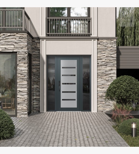 Modern Steel Front Door Diamond C7 64" x 80" anthracite/anthracite mirrored Glass Panel stainless steel RHI with 2 Sidelites mirrored Glass