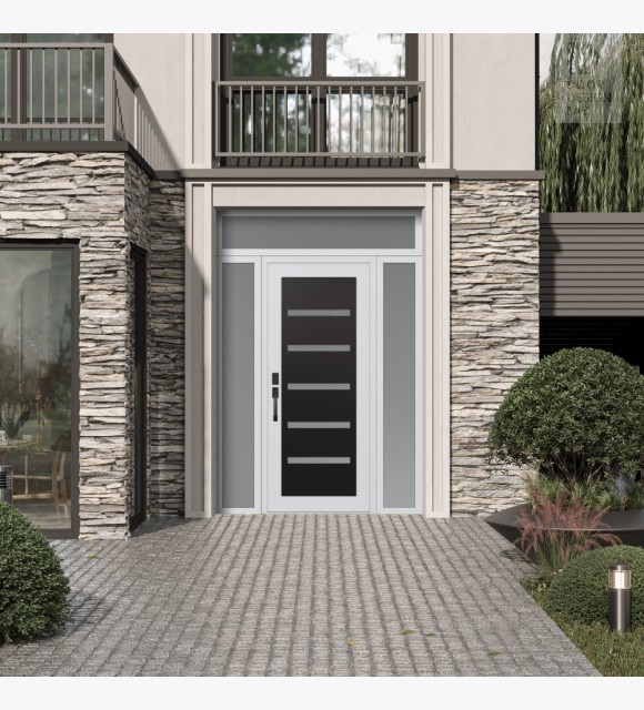 Modern Steel Front Door Diamond C7 64" x 96" white/white frosted Glass Panel black RHI with 2 Sidelites and Transom frosted Glass