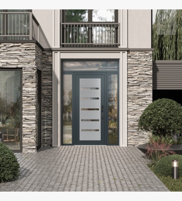 Modern Steel Front Door Diamond C7 68" x 96" anthracite/anthracite clear Glass Panel stainless steel LHI with 2 Sidelites and Transom clear Glass