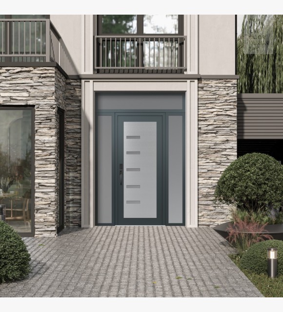 Modern Steel Front Door Diamond C8 68" x 96" anthracite/anthracite frosted Glass Panel stainless steel RHI with 2 Sidelites and Transom frosted Glass