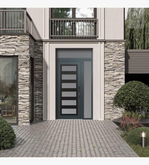 Modern Steel Front Door Diamond C9 48" x 96" anthracite/anthracite frosted Glass Panel black LHI with Sidelite and Transom frosted Glass